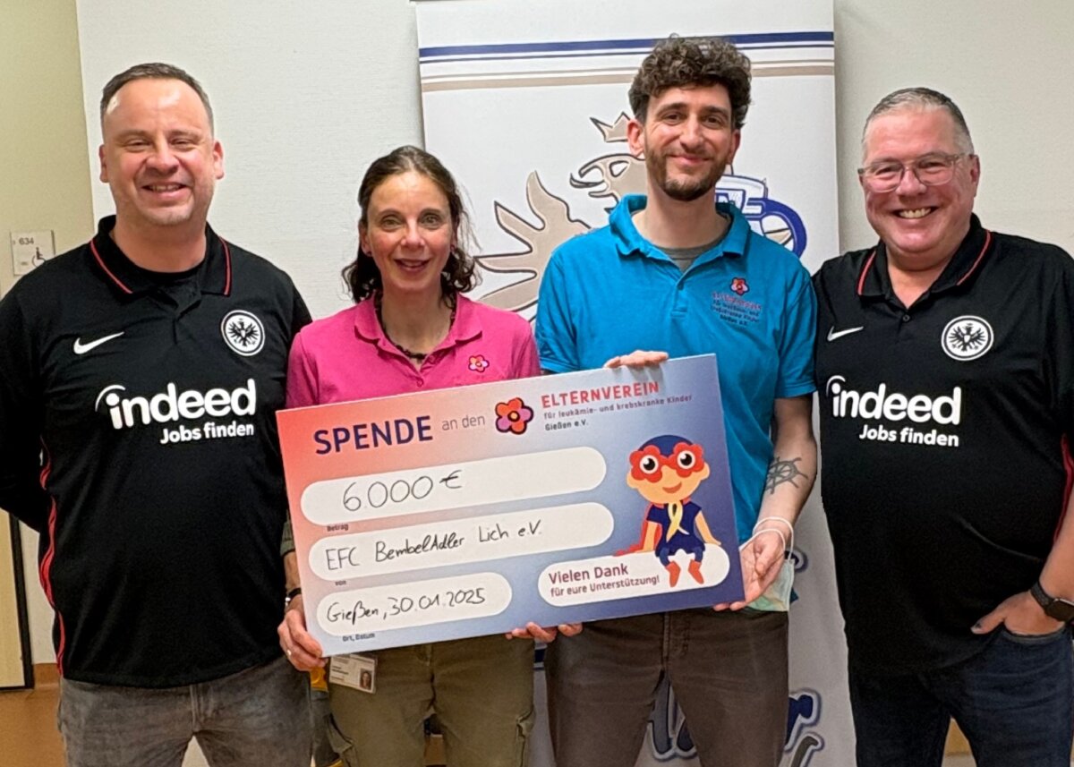 Die Mitglieder des Eintracht Frankfurt Fanclubs BembelAdler Lich e.V. zeigten Ende des letzten Jahres großen Einsatz für einen guten Zweck: Im Rahmen des Ober-Bessinger Krippenweges sorgten sie mit heißem Apfelwein, Würstchen sowie weiteren Leckereien für das leibliche Wohl der Besucher. Der Erlös aus dieser Veranstaltung wurde von den Vereinsmitgliedern großzügig aufgestockt. Darüber hinaus sicherte sich der Fanclub den ersten Platz bei einer Förderaktion der indeed Deutschland GmbH. Somit konnte nun eine Spende in Höhe von 6.000 Euro an den Elternverein für leukämie- und krebskranke Kinder Gießen e. V. übergeben werden.