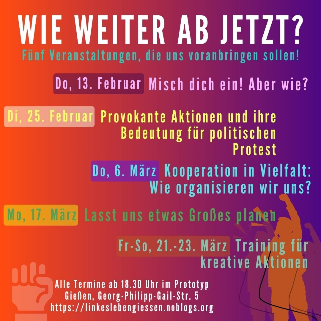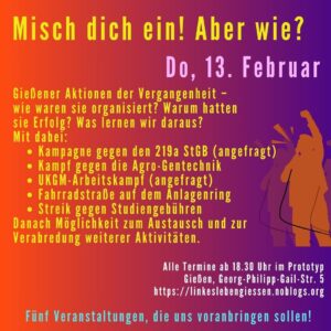Die Gießener Großdemo “Nie wieder ist jetzt!” am 8.2. (14.30 Uhr ab Berliner Platz) soll kein Einzelereignis sein. Daher wollen mehrere Personen aus dem Vorbereitungskreis und aus weiteren politisch aktiven Kreisen in und um Gießen im Anschluss zu mehrere Veranstaltungen einladen, die im ersten Schritt Einblicke in wirkungsvolle Aktionsformen geben und danach gemeinsame Aktionen und bessere Kooperation über Gruppengrenzen hinweg entwickeln sollen. Der Starttermin findet am Donnerstag, 13. Februar, um 18.30 Uhr im Gießener Prototyp (Georg-Philipp-Gail-Str. 5) unter dem Titel “Misch dich ein! Aber wie?” statt. Verschiedene Akteur*innen stellen dort Gießener Aktionen der Vergangenheit vor: Wie waren sie organisiert? Warum hatten sie Erfolg? Was lässt sich daraus lernen für die Zukunft? Eingeladen wurden die Kampagne gegen den 219a StGB, Aktive aus dem Kampf gegen die Agrogentechnik, aus dem UKGM-Arbeitskampf, dem Ringen um die Fahrradstraße auf dem Anlagenring und aus dem Streik gegen Studiengebühren. Nach deren Kurzvorstellung besteht die Möglichkeit zu Nachfragen, zum Austausch und zur Verabredung weiterer Aktivitäten.