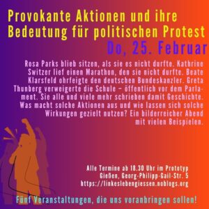 Die zweite Veranstaltung findet am Dienstag, 25. Februar, um 18.30 Uhr ebenfalls im Prototyp statt. Gezeigt werden eindrucksvolle Beispiele für “Provokante Aktionen und ihre Bedeutung für politischen Protest”. Mit dabei sind Rosa Parks, die sitzen blieb, als sie es nicht durfte, Kathrine Switzer, die einen Marathon lief, den sie nicht durfte, zudem Bate Klarsfeld, die den deutschen Bundeskanzler ohrfeigte, und Greta Thunberg, die die Schule verweigerte – öffentlich vor dem Parlament. Sie alle und viele mehr schrieben damit Geschichte. Was macht solche Aktionen aus und wie lassen sich solche Wirkungen gezielt nutzen? Das soll der bilderreiche Abend mit vielen Beispielen klären.