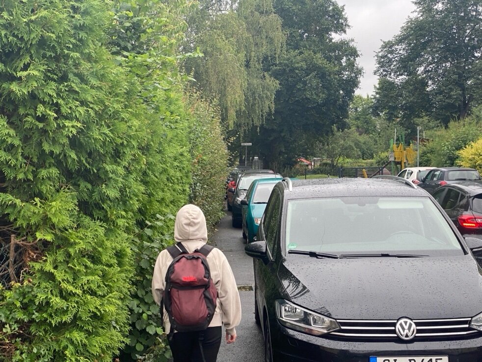 Vor 12 Jahren (!) hat die Stadt Gießen die Straße „Am Unteren Rain“ im Schiffenberger Tal als Tempo-30-Zone ausgewiesen und immerhin auch Schilderrahmen aufgestellt, um hier Zonen-Parkverbote einfügen zu können. Ziel war es laut VCD, ohne größeren baulichen Aufwand das Parken auf den Seitenstreifen zu unterbinden, um auf ihnen eine sichere Fußwegverbindung zwischen Heegstrauchweg und Schiffenberger Weg zu schaffen. Doch umgesetzt wurde das bis heute nicht: Wer hier zu Fuß geht, muss zwischen parkenden Autos „Slalom laufen, sich in Hecken pressen oder auf die Fahrbahn ausweichen. Nichts für Kinderwagen, Rollatoren und anderen, die mehr Platz brauchen oder weniger gut zu Fuß sind“, so VCD-Vorstandsmitglied Dietmar Jürgens.