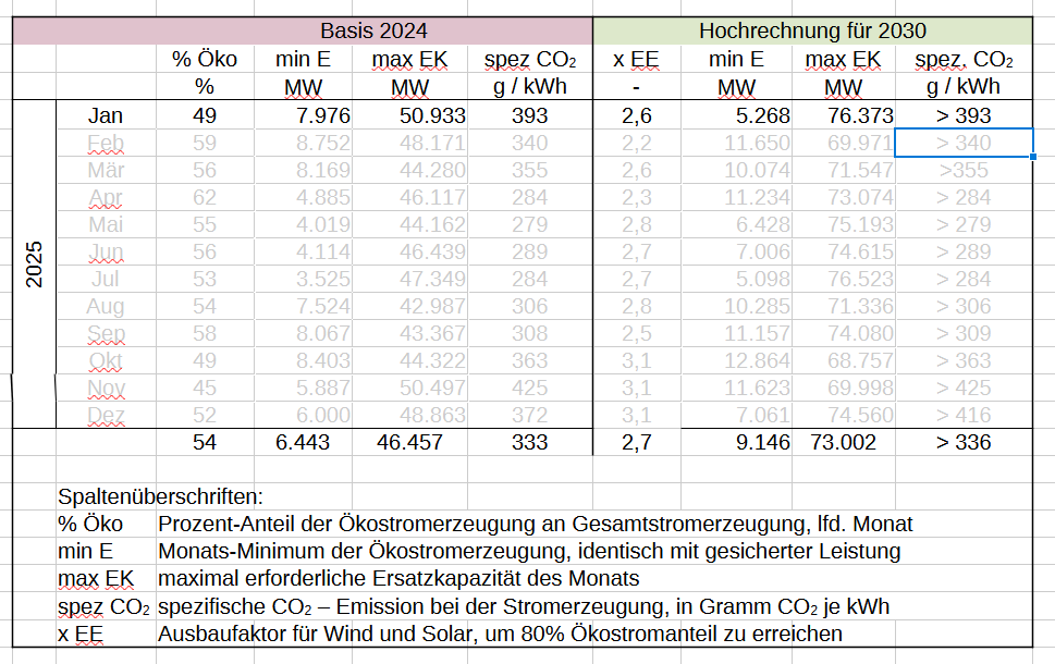Der 80% – Anteil des Ökostroms am Verbrauch würde durch Ausbau der aktuellen erneuerbaren Erzeugungskapazität um den Faktor 2,6 zwar planmäßig erreicht, aber als Durchschnittswert und, aufgrund der nicht aufgehobenen Volatilität, nur an 13 von 31 Tagen. Die immer noch erforderliche Ersatzstrombeschaffung stammt weiterhin überwiegend aus fossiler Kraftwerkstechnik, und auch weiterhin aus importiertem “Atomstrom”. Daher wird der in der Tabelle angegebene CO2 – Ausstoß im Januar 2030 bei sehr viel mehr als 393 Gramm je kWh Stromerzeugung liegen. Der genaue Wert in 2030 hängt vom dann erreichten Strommarktdesign ab.