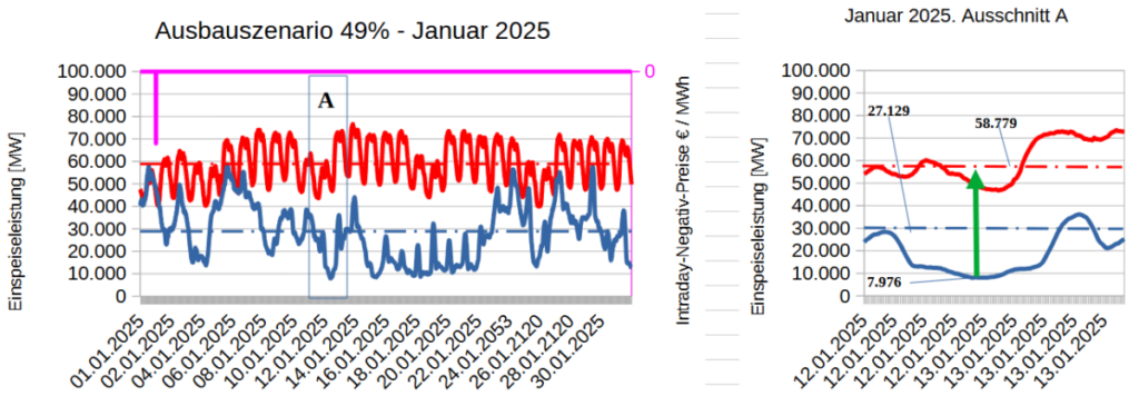 Bild 2: Verläufe von Stromerzeugung aus Ökoenergie und Stromverbrauch Januar 2030, hochgerechnet aus Januar 2025 entsprechend Planungsziel des BMWK für 2030 [4]; rechts Ausschnitt A mit größtem Reservebedarf (grüner Pfeil).