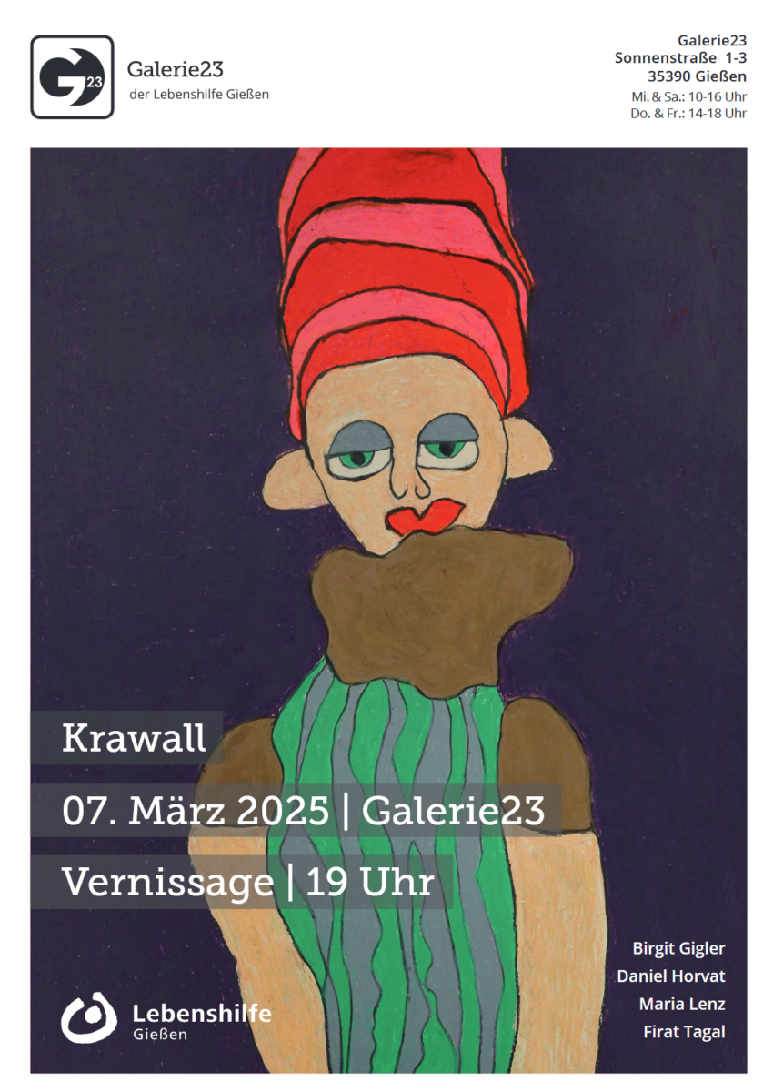 Gießen (-). Nachdem der Betrieb der Galerie23 der Lebenshilfe Gießen vergangenes Jahr an dem neuen Standort in der Sonnenstraße wieder aufgenommen werden konnte, findet nun der regelmäßige Ausstellungszyklus statt. Die Galerie23 wechselt quartalsweise die Ausstellungen und damit auch die gesamte Erscheinung. Am 7. März um 19:00 Uhr ist es wieder so weit und die neue Ausstellung „Krawall“ wird eröffnet. Die Künstler*innen Birgit Gigler, Daniel Horvat, Maria Lenz und Firat Tagal zeigen ihre künstlerischen Werke und sind bei der Eröffnung anwesend.