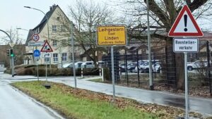 LINDEN – Du fährst mit deinem Auto von Gießen kommend nach Linden Leihgestern. Vor dem Ortsschild wirst du durch ein Verkehrsschild auf eine folgende Baustelle hingewiesen. Wenige Meter später steht das Ortsschild und du darfst dann noch maximal 50 km/h fahren. Dann folgt ein Rohr als Schilderträger an dem kein Schild montiert ist. Dann kommt das nächste Hinweisschild auf die Baustelle, wenn du rechts abbiegst. Bevor du dich dann entscheidest, ob du rechts abbiegst oder geradeaus fährst, steht ein weiterer Schilderträger und weist auf das Ende des Radweges hin. Darüber ein kleines Schild mit Daten zu einer Versorgungsleitung. Dann siehst du den Hinweis „rechts geht es zur Volkshalle und zur Wiesengrundschule“ An der Spitze des Schilderträgerrohres wurde das Schild mit der Begrenzung der Höchstgeschwindigkeit auf 30 km/h montiert.