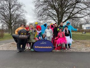 Beim Schwanenteich parkrun geht es darum, in Gesellschaft aktiv zu sein – am Samstagmorgen um 9 Uhr in der Wieseckaue 5km zu gehen, walken, joggen oder zu helfen. Das klingt erst einmal einfach, das ist es auch und so soll es auch immer bleiben. Gleichzeitig bieten sich immer mal wieder Gelegenheiten, das einfache ein bisschen besonderer zu machen und noch mehr Freude zusammen zu haben. Nach dem Motto: “Wir feiern die parkrun-Feste wie sie fallen” gibt es direkt vier Highlights im März: In den bunten Monat gestartet sind am 1.3. bereits 86 Teilnehmende und 12 Helfende mit einem Faschingsparkrun, bei dem es einige tolle Kostüme zu sehen gab.