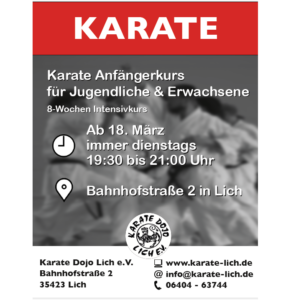 den 18. März 2025. Er vermittelt die Grundlagen der japanischen Kampfkunst und ermöglicht den anschließenden Einstieg als Mitglied in eine fortlaufende Gruppe des Vereins. Es werden keine Vorkenntnisse benötigt. Aber auch Wiedereinsteiger, die vielleicht vor vielen Jahren schon einmal Karate oder eine andere Kampfsportart ausgeübt haben, sind herzlich willkommen. Trainiert wird dienstags ab 19:30 Uhr in einfacher Sportkleidung und barfuß in der Halle des Karate Dojo in der Bahnhofstraße 2 in Lich.