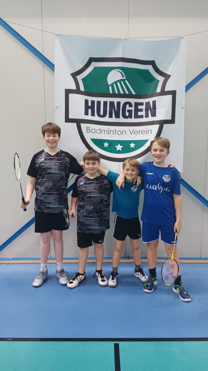 Nachdem die Schülermannschaft der Hungener Badmintonspieler bereits die Bezirksmeisterschaft gewonnen hatte, holte sich auch das U13 Team ungeschlagen die Meisterschaft. Das junge Team um Jano Lehmann, Anna Sphylko, Nevio Maikranz, Arno Plenz und Finn Beyer spielte technisch sauberes Badminton und gewann sämtliche Spiele der Runde.