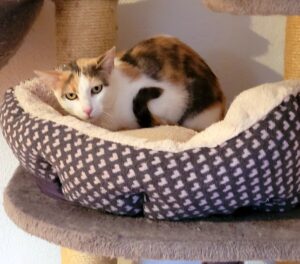 Zara , geboren im Juni 2024, ist ein sensibles Kätzchen. Noch findet sie die streichenden Hände etwas “gruselig”, beginnt aber auch langsam, Kuschelheinheiten zu genießen.
