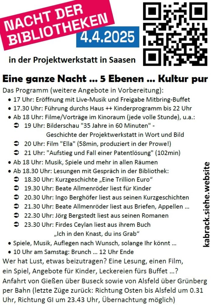 Wenn am 4. April deutschlandweit viele Bibliotheken in den Abendstunden besondere Angebote machen, wird auch die Projektwerkstatt Saasen dabei sein. Schließlich beherbergt das kunterbunte Haus in der Ludwigstraße 11 eine der größten, selbstorganisierten Fach- und politischen Bibliotheken des Landes. Zudem gibt es Räume voller Spiele, Sammlungen von Filmen und einen Musikraum mit schöner Gewölbedeckenatmosphäre. Ab 17 Uhr bieten sie Platz für eigene Ideen, Angebote und den Genuss dessen, was an Programm angeboten wird. Das beginnt mit der Eröffnung, umrahmender Live-Musik und der Freigabe des Mitbring-Buffets, zu dem Besucher*innen auch mit eigenen Kreationen und Mitbringsels etwas beitragen können. Um 17.30 Uhr folgt dann eine Führung durch die Räume und die erste Lesung. Ab 18 Uhr starten Filme und Vorträge im Kinoraum. Besondere Highlights könnten die Bilderschau zur Geschichte der Projektwerkstatt um 19 Uhr und die zwei anschließenden Filme „Ella” und “Aufstieg und Fall einer Patentlösung” werden, allesamt Eigenproduktionen aus der Filmwerkstatt des Hauses sind. Die Lesungen, die um 18.30 Uhr mit der Kurzgeschichte „Eine Trillion Euro“ zwischen den auch räumlich beeindruckenden Bücherregalen stattfinden, bieten sehr unterschiedliche Kulturkost. Viermal lesen sogar Autor*innen aus eigenen Werken: Um 20.30 Uhr der Journalist Ingo Berghöfer aus eigenen Geschichten, anschließend die ehemalige Schulpfarrerin Beate Allmenröder aus Briefen und Eingaben, danach der schreibende Aktivist Jörg Bergstedt aus seinen beiden Romanen. Um 23.30 Uhr folgt Firdes Ceylan mit ihrem Buch „Ich in den Knast, du ins Grab“.
