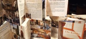 Diese informative Sammlung fügten sie zusammen in einem „Leporello“ oder Faltbuch, das aus einem gefalteten Papierstreifen besteht und sich wie ein Balg einer Ziehharmonika durch Auseinanderziehen öffnen lässt. Erst klein gefaltet mit der Aufschrift „Die Kirche“, öffnen sich beim Auseinanderfalten sechs Seiten vorne und sechs Seiten hinten, mit Texten im Wechsel mit Bildern.
