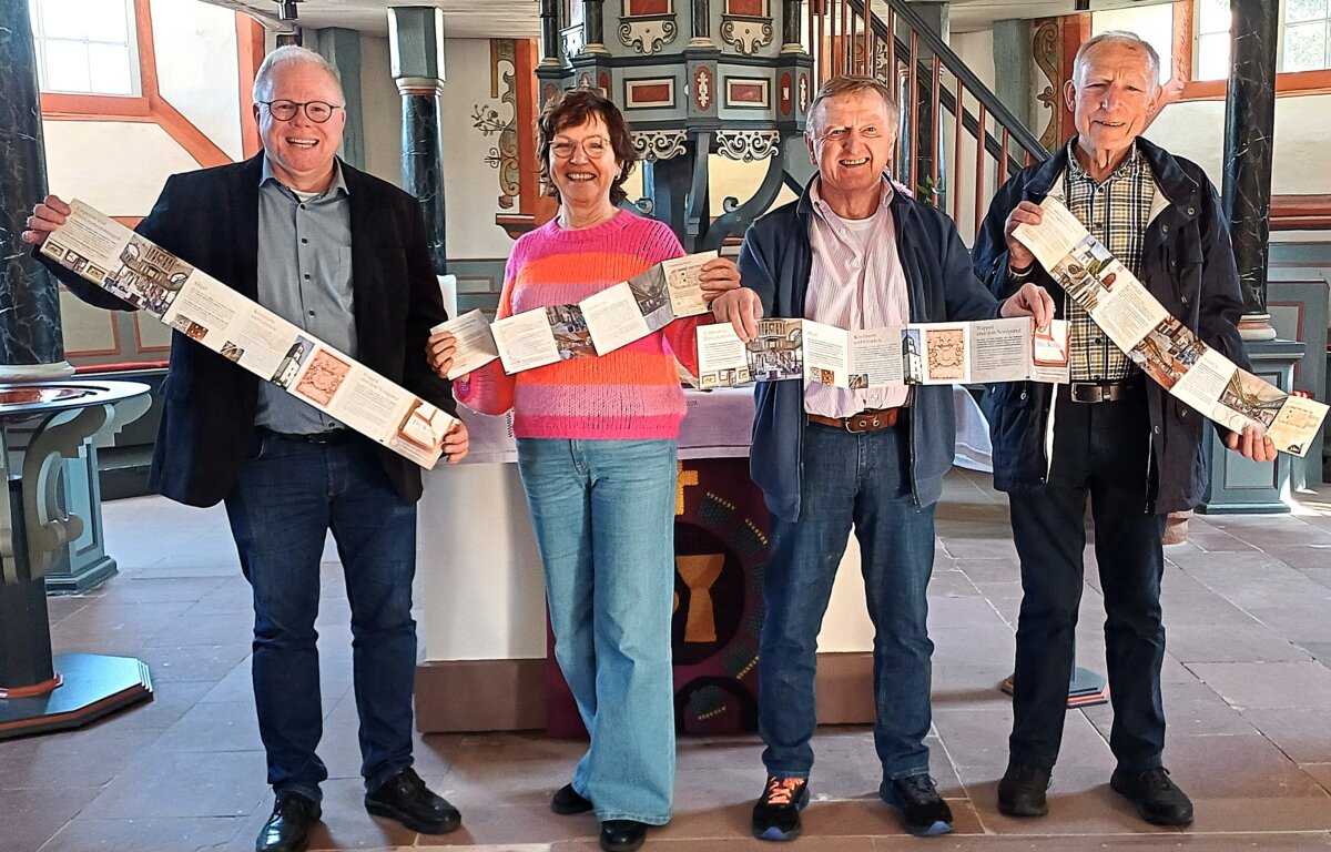 Die Ideen des Kirchenvorstandes der Evangelischen Kirchengemeinde Holzheim, zur „Kirche“, wurde durch das Team Matthias Bubel, Dr. Angela Stender, Albert Mehl und Herbert Jung (v.l.) in einem faltbaren „Leporello“ umgesetzt und nun zur Verteilung veröffentlicht