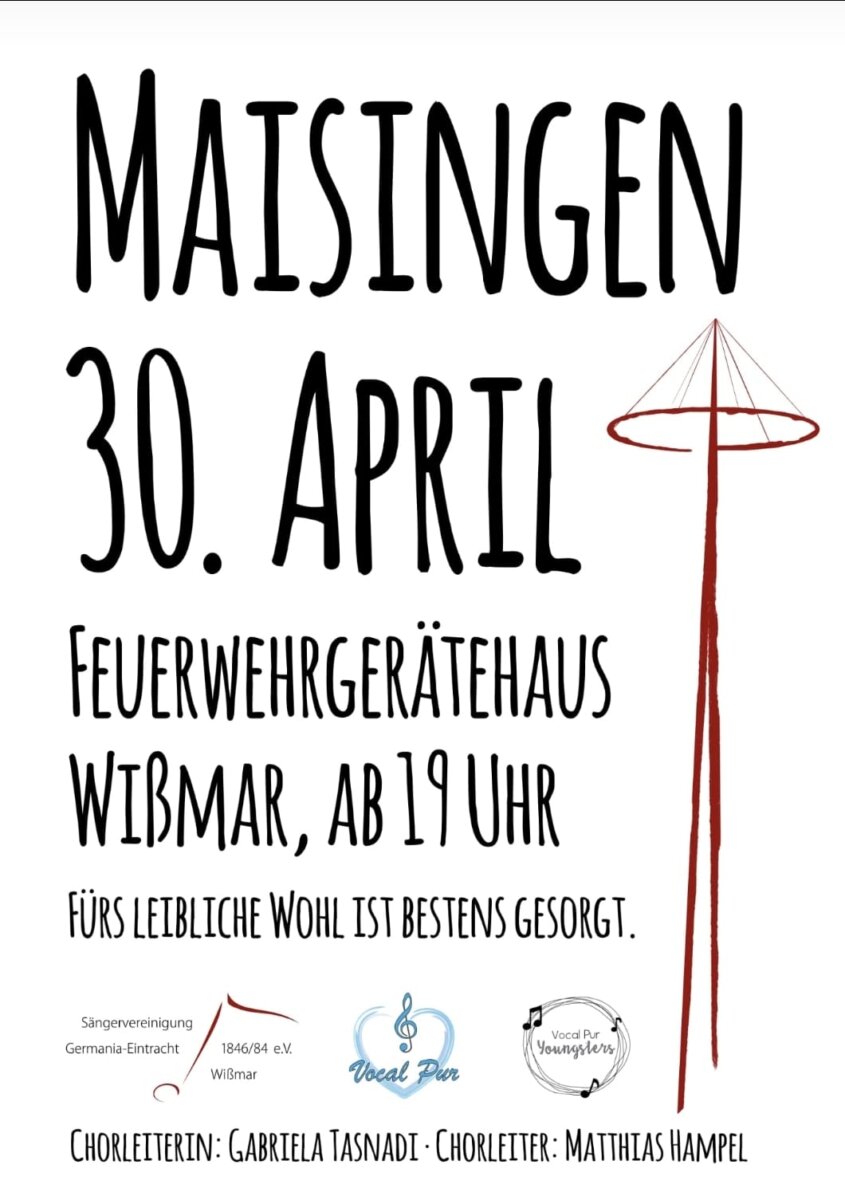 Die Sängervereinigung Germania-Eintracht Wißmar lädt alle aktiven, passiven und ehemaligen Mitglieder sowie die Allgemeinheit am Mittwoch, 30. April um 19 Uhr zu ihrem traditionellen „Singen in den Mai“ unter dem Dach der Freiwilligen Feuerwehr, Am Festplatz 16 in Wißmar ganz herzlich ein. Freuen Sie sich auf ein paar gesellige Stunden im Kreise der Sängerfamilie mit Beiträgen aller Chöre, leckeren Snacks und Kaltgetränken. Und wenn Ihnen unsere Chöre gefallen haben, finden Sie alle Details zu Probetagen und -zeiten auf unserer Homepage saengervereinigung-wissmar.de.