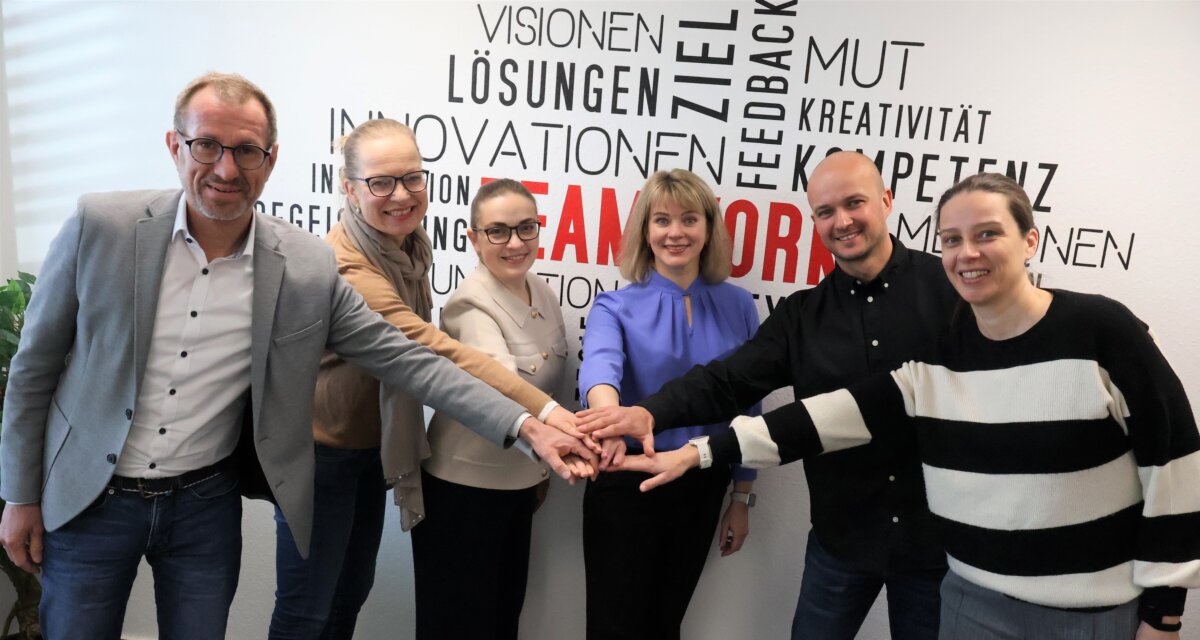 Bildtext von links: Michael Beck (Vorsitzender der Geschäftsführung), Christiane Meyer-Fenderl (Hochschulberatung), Natalia Zharikova, Olha Velyehko, Taras Kravchenko, Iris Heilgendorf (Hochschulberatung)