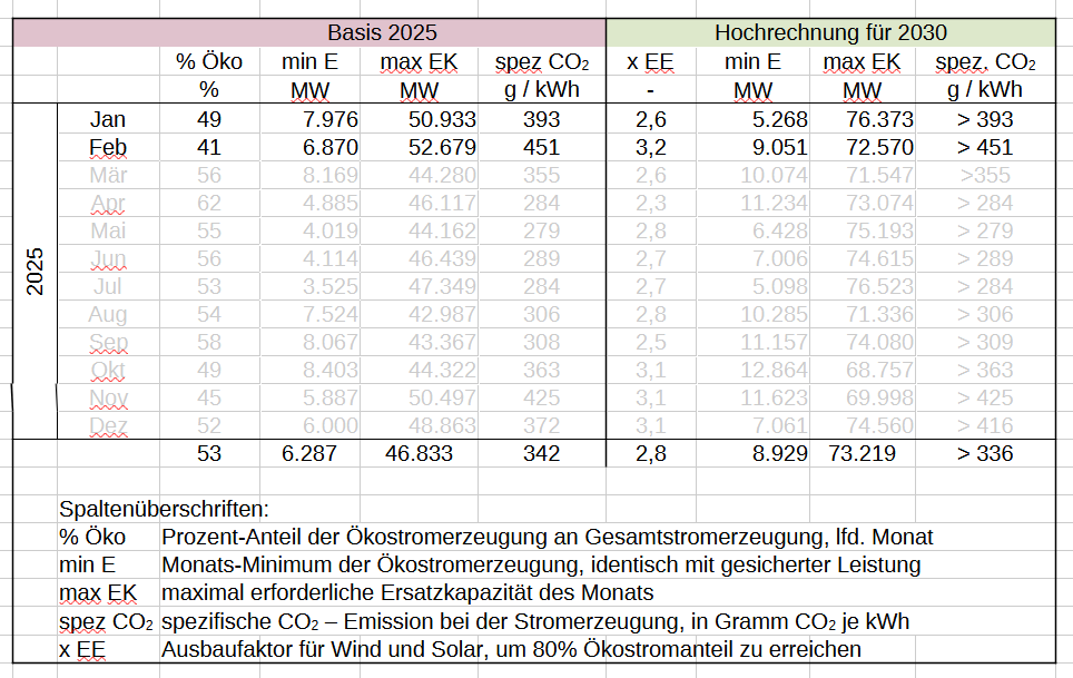 Der 80% – Anteil des Ökostroms am Verbrauch würde durch Ausbau der aktuellen erneuerbaren Erzeugungskapazität um den Faktor 3,2 zwar planmäßig erreicht, aber als Durchschnittswert und, aufgrund der nicht aufgehobenen Volatilität, nur an 13 von 28 Tagen. Die immer noch erforderliche Ersatzstrombeschaffung stammt weiterhin überwiegend aus fossiler Kraftwerkstechnik, und auch weiterhin aus importiertem “Atomstrom”. Daher wird der in der Tabelle angegebene CO2 – Ausstoß im Januar 2030 bei sehr viel mehr als 491 Gramm je kWh Stromerzeugung liegen. Der genaue Wert in 2030 hängt vom dann erreichten Strommarktdesign ab.