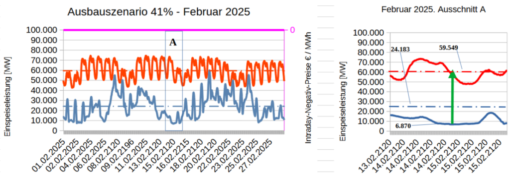 Bild 2: Verläufe von Stromerzeugung aus Ökoenergie und Stromverbrauch Februar 2030, hochgerechnet aus Februar 2025 entsprechend Planungsziel des BMWK für 2030 [4]; rechts Ausschnitt A mit größtem Reservebedarf (grüner Pfeil).