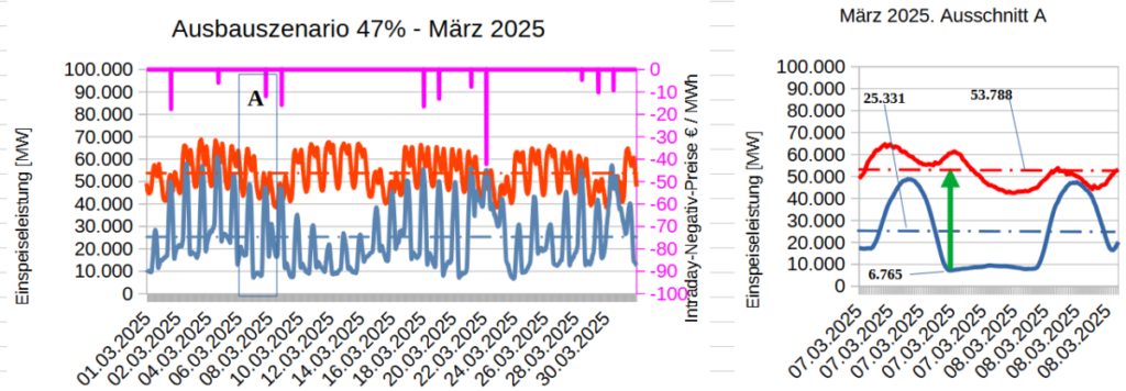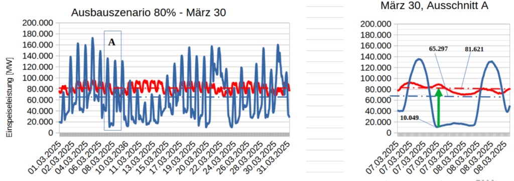 Bild 2: Verläufe von Stromerzeugung aus Ökoenergie und Stromverbrauch März 2030, hochgerechnet aus März 2025 entsprechend Planungsziel des BMWK für 2030 [4]; rechts Ausschnitt A mit größtem Reservebedarf (grüner Pfeil).