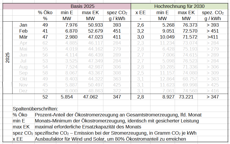 Der 80% – Anteil des Ökostroms am Verbrauch würde durch Ausbau der aktuellen erneuerbaren Erzeugungskapazität um den Faktor 3,0 zwar planmäßig erreicht, aber als Durchschnittswert und, aufgrund der nicht aufgehobenen Volatilität, nur an 13 von 31 Tagen. Die immer noch erforderliche Ersatzstrombeschaffung stammt weiterhin überwiegend aus fossiler Kraftwerkstechnik, und auch weiterhin aus importiertem “Atomstrom”. Daher wird der in der Tabelle angegebene CO2 – Ausstoß im März 2030 bei sehr viel mehr als 411 Gramm je kWh Stromerzeugung liegen. Der genaue Wert in 2030 hängt vom dann erreichten Strommarktdesign ab.