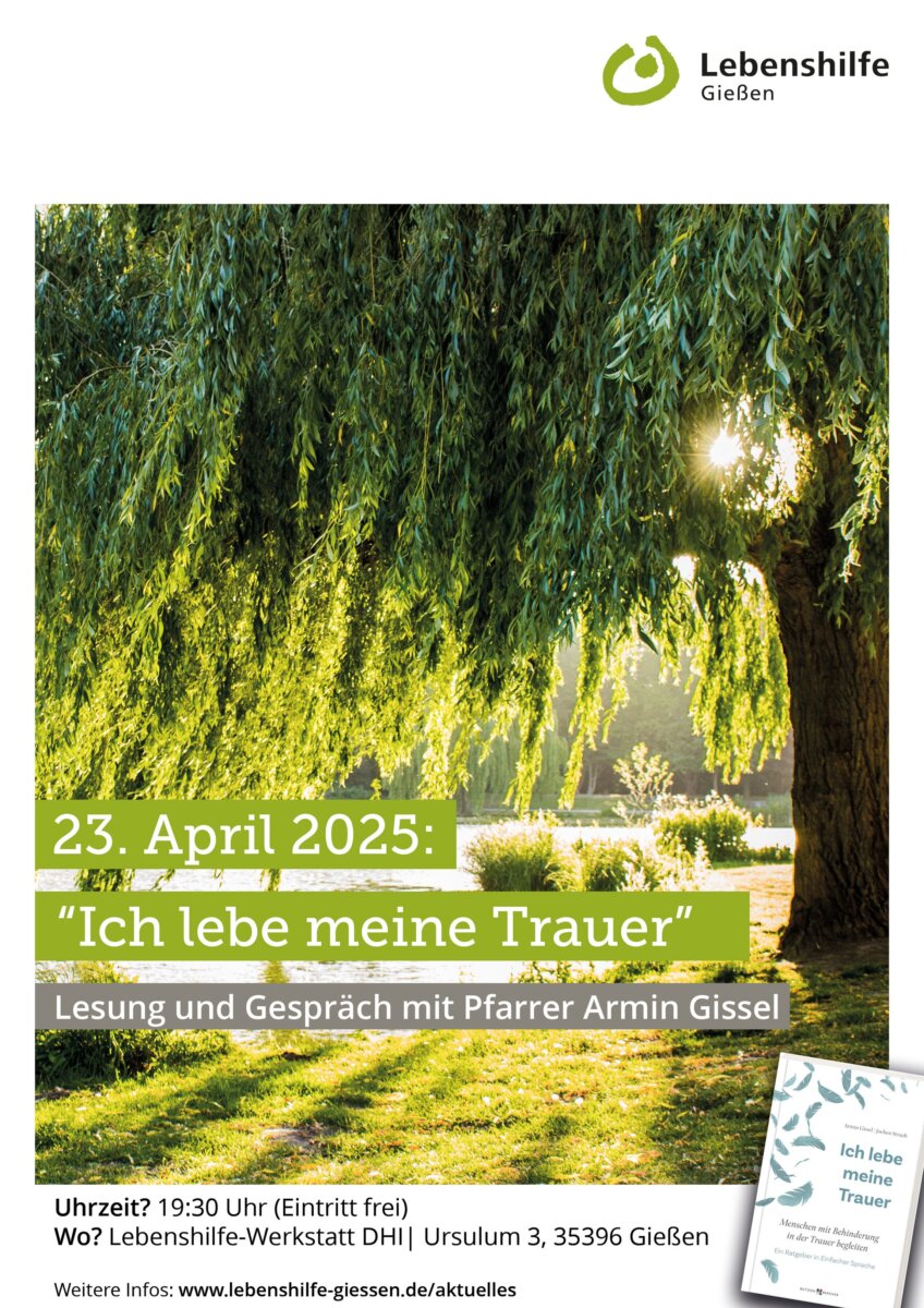 Gießen – Am 23. April um 19:30 Uhr lädt die Lebenshilfe Gießen in ihrer Werkstatt DHI in Gießen (Ursulum 3, 35396 Gießen) zu einer Lesung mit anschließendem Gespräch zum Thema Trauerarbeit ein. Pfarrer Armin Gissel wird aus seinem Buch „Ich lebe meine Trauer – Menschen mit Behinderung in der Trauer begleiten“ lesen und dabei seine umfangreichen Erfahrungen aus 25 Jahren in der Behindertenseelsorge einbringen.
