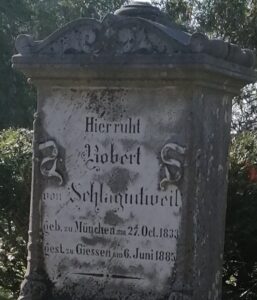 Robert Schlagintweit (1833 – 1885), Reisender und Entdecker. Robert beteiligte sich zunächst an der geologischen und meteorologischen Erforschung der Alpen; mit seinen Brüdern Hermann und Adolf unternahm er auf Vermittlung Alexander von Humboldts eine dreijährige Expeditionsreise nach Indien, die zu wichtigen Erkenntnissen zur Hochgebirgswelt des Himalaya führte. Robert wurde 1864 erster Professor der Geografie in Gießen.