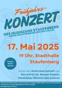 Das traditionelle Frühjahrskonzert des Musikzugs Staufenberg findet in diesem Jahr am 17. Mai 2025, ab 19 Uhr, in der Stadthalle in Staufenberg statt. Unter der Mitwirkung des JBO Lollars wird das Konzert von Marlon Esenkan dirigiert. Der diesjährige Schirmherr ist Prof. Dr. Roman Poseck, Hessischer Minister des Inneren, der sein Kommen angekündigt hat.