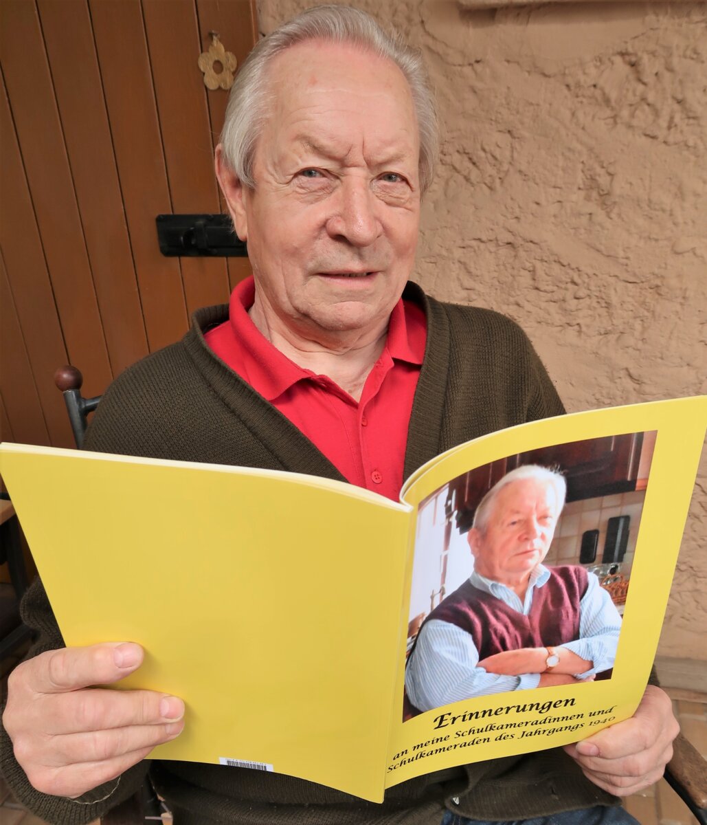 Das Foto zeigt Heinrich Amend mit einem Bildband -Erinnerungen- aus der Schüler- und Jugendzeit, sowie aus den Jahrgangszusammenkünften der letzten Jahre. Schulkamerad Rudi Ehmig hatte die „fotografischen Erinnerungen“ zusammengetragen und an Heinrich Amends runden Geburtstag überreicht.