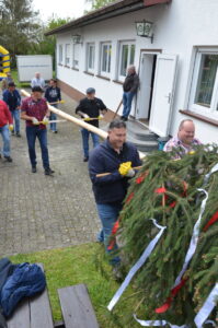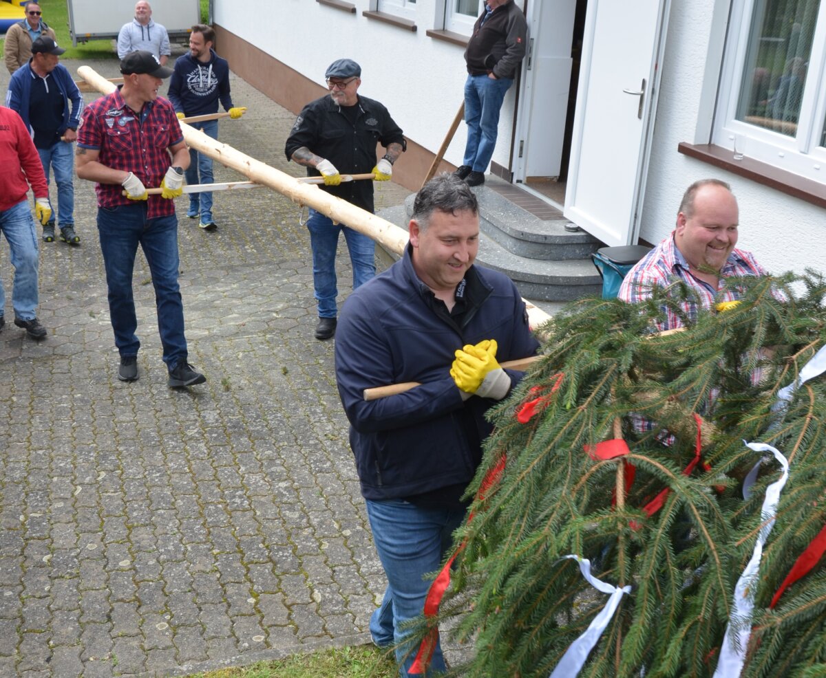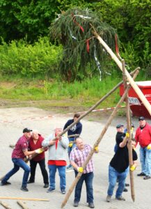 Die Traditionsfeier beginnt um 11.30 mit dem Aufstellen des Maibaums. Ein sehenswertes Spektakel mit viel Muskelkraft der Männer des VW-Club.