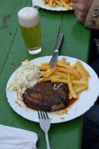 Zum Mittagessen gibt es Schnitzel, Hackbraten, Würstchen, Pommes und das Kaltgetränk „aus dem Herzen der Natur“.