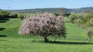 An blühenden Obstbäumen und Blumenwiesen vorbei ging es jetzt abwärts, bis nach 8 km die evangelische Kirche in Bad Salzschlirf erreicht war. Hier ging ein herzliches Dankeschön an Simone Fremdt für die Auswahl der Lieblingstour.