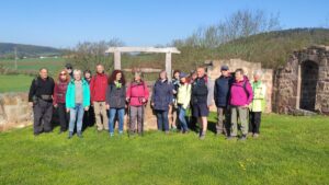 An blühenden Obstbäumen und Blumenwiesen vorbei ging es jetzt abwärts, bis nach 8 km die evangelische Kirche in Bad Salzschlirf erreicht war. Hier ging ein herzliches Dankeschön an Simone Fremdt für die Auswahl der Lieblingstour.