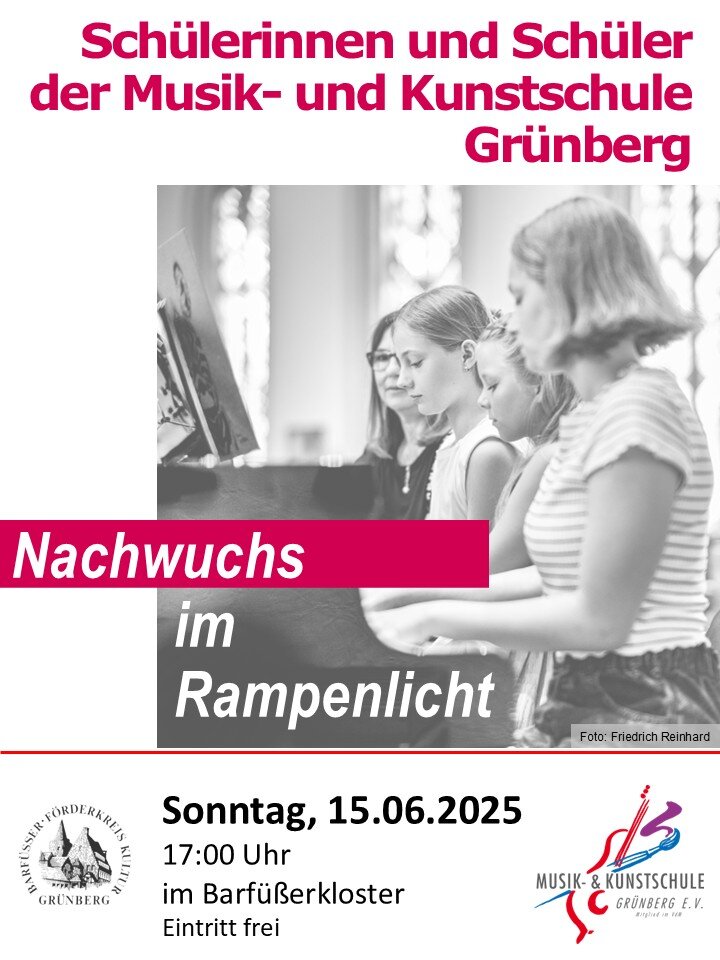 Schülerinnen und Schüler der Musik- und Kunstschule Grünberg zeigen ihr musikalisches Können – und das ist beachtlich. Sie tragen sowohl moderne Kompositionen vor, bekannt aus Film und Fernsehen, als auch traditionelle klassische Werke wie zum Beispiel von J. S. Bach. Ebenso gibt es einen Ausflug in den Bereich des Jazz. Das Publikum kann gespannt sein auf ein vielfältiges Programm des Grünberger musikalischen Nachwuchses.