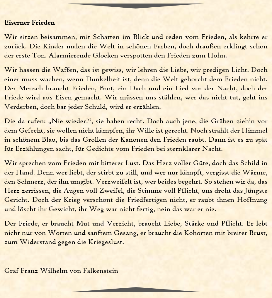 Der Friede, er braucht Mut und Verzicht, braucht Liebe, Stärke und Pflicht. Er lebt nicht nur von Worten und sanftem Gesang, er braucht die Kohorten mit breiter Brust, zum Widerstand gegen die Kriegeslust.