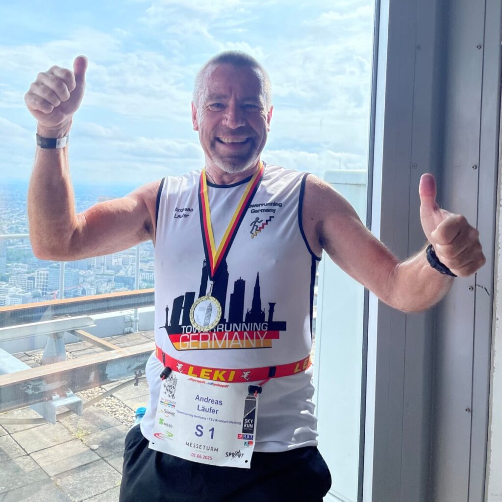 Jürgen Leib als Mitglied des geschäftsführenden Vorstands des TSV unterstützt Andreas Läufer bei der Durchführung, ebenso Michael Lederer, Race-Director des SkyRun Messeturm Frankfurt.