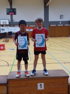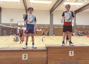Sonntags folgte dann ein Auftritt im Jungendoppel, den man als kleine Sensation bezeichnen kann. Gemeinsam mit seinem Doppelpartner Chenyi “Eason” Cai (TURA Niederhöchststadt) holte sich Beyer den zweiten Turniersieg. Als Nummer drei der Setzliste spielten das jungen Doppel stark auf und bezwangen im Halbfinale das an zwei gesetzte Brüderdoppel Aaron und Aris Kohaut (Tv Neckargemünd) mit 21:16 21:14. Darauf folgte das Finale gegen das an eins gesetzte Spitzendoppel Luke Si/ Shi Liu. Sehr nervös starteten Beyer/Cai im ersten Satz, welchen sie auch knapp 17:21 verloren. Danach fanden sie besser ins Spiel, kämpften miteinander und gewannen den zweiten Satz knapp 21:18. Im entscheidende dritten Satz zogen sie schnell den chinesischen Doppel davon, ließen diese nicht mehr ran kommen und drehten das Finale noch zu ihren Gunsten. Am Ende siegten sie 17:21 21:18 21:10 in einem packendem Finalspiel.