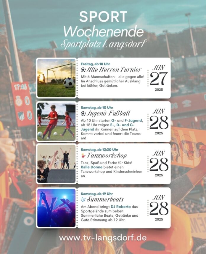 Am 27. und 28. Juni 2025 lädt der TV Langsdorf zum Sportwochenende auf das Vereinsgelände, dem Sportplatz in Langsdorf, ein. An zwei Tagen erwartet die Besucher ein abwechslungsreiches Programm aus Fußball, Kindertanz und Musik.