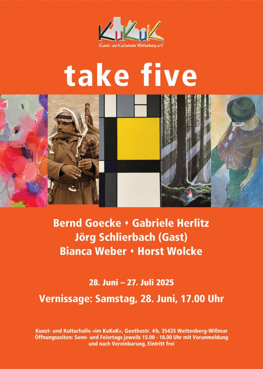 Ab Samstag, den 28. Juni, heißt es „take five“ in der Kunsthalle des KuKuK in Wißmar. Dies ist nicht etwa ein Jazz- Konzert im 5/4 – Takt nach Dave Brubeck, sondern die neue Kunstausstellung, die hier von fünf Kunstschaffenden gemeinsam gestaltet wird. Bernd Goecke, Gabi Herlitz, Bianca Weber und Horst Wolcke sind Mitglieder des KuKuK, Jörg Schlierbach aus Biebertal nimmt als Gast teil.