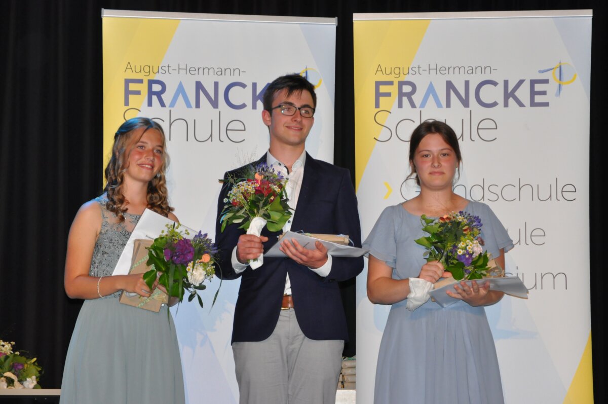 Unter reger Anteilnahme der Schulgemeinschaft feierten 42 Schülerinnen und Schüler den Abschluss ihrer Realschulzeit an der August-Hermann-Francke-Schule. Dank zahlreicher Begabungen präsentierten sie den anwesenden Familien und Lehrkräften ein buntes und abwechslungsreiches Programm mit Schwung und Musik. Stefanie Weil, die Leiterin des Realschulzweiges, konnte verkünden, dass 27 der Absolvierenden den Qualifizierenden Abschluss geschafft hatten, somit also die Berechtigung zum Besuch einer Oberstufe erwarben. Sie dankte Dieter Glaum und Julian Phan für die engagierte Klassenleitung in den vergangenen Jahren. Schulleiter Johannes Wunderlich gratulierte nicht nur den Jugendlichen, sondern auch ihren Eltern, die den Schulweg bis dahin unterstützend begleitet hatten. Die drei besten Zeugnisse konnte er überreichen an Melanie Matthies, Jonas Will und Salome Michailus; sie hatten mit Noten zwischen 1,0 und 1,5 abgeschlossen. Nachdem auch alle übrigen jungen Menschen glücklich ihre Sträuße und Urkunden erhalten hatten und die Elternvertreter Segensgebete gesprochen hatten, klang der Abend in einem von frohen Stimmen begleiteten Buffet aus.