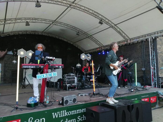 Über 1000 begeisterte Besucher feierten mit Back 2 the 80s eine ausgelassene Party. Kein Sitzplatz war mehr zu finden als um Punkt 20.00 Uhr die Titelmelodie der Sendung Na Sowas von Thomas Gottschalk aus den 80ern ertönte und ab da verwandelte die Nostalgie Combo den Gießener Hausberg für die nächsten 2 Stunden in eine Open Air Disco. Ohne Pause powerten die vier Musiker einen Hit nach den anderen auf der mit 80iger Jahre Requisiten gespickten Bühne. Große Discokugeln, Zauberwürfel und ein original Ghetto Blaster sorgten für Atmosphäre. Kurz zuvor hatte HR3 die Veranstaltung noch angekündigt und viele sind der Aufforderung gefolgt. Das war schon etwas Besonderes sagte die Verantwortliche der Stadt Gießen, Stephanie Jackson, die die 80er auf den Schiffenberg geholt hatte. Neue Deutsche Welle mit Major Tom, Carbonara und Hurra die Schule brennt gefolgt von Disco der 80er mit Billy Ocean, Delegation und Kathy and the Sunshine Band und Rock’n’Roll von Queen, ELO und Shakin` Stevens in einem furiosen Finale mündend mit ZZ Top, Pink Floyd und Rainbow. Stefan Ackermann brillierte einmal mehr mit seinen furiosen Gitarrensoli und seiner markanten Pop-Stimme, mit welcher die Band erst kürzlich den Rock und Pop Preis gewonnen hatte. Roger Haberditzl überzeugte nicht nur als Solist von Marie Marie und der Kommissar, sondern vor allem mit seinem akkuraten Schlagzeugspiel und der ein oder anderen Comedyeinlage. Ralf Enzmann ließ bei Doctor Doctor und Gimmi all your lovin eine ganz neue Rock-Fassette der Band aufleuchten. Sawellion tanzte in gewohnter Manier auf den Tischen der Zuhörer und der Schiffenberg tanzte mit, vor allem bei Achy breacky heart hielt es keine auf den Sitzen und es wurde Freestyle vor der Bühne getanzt.