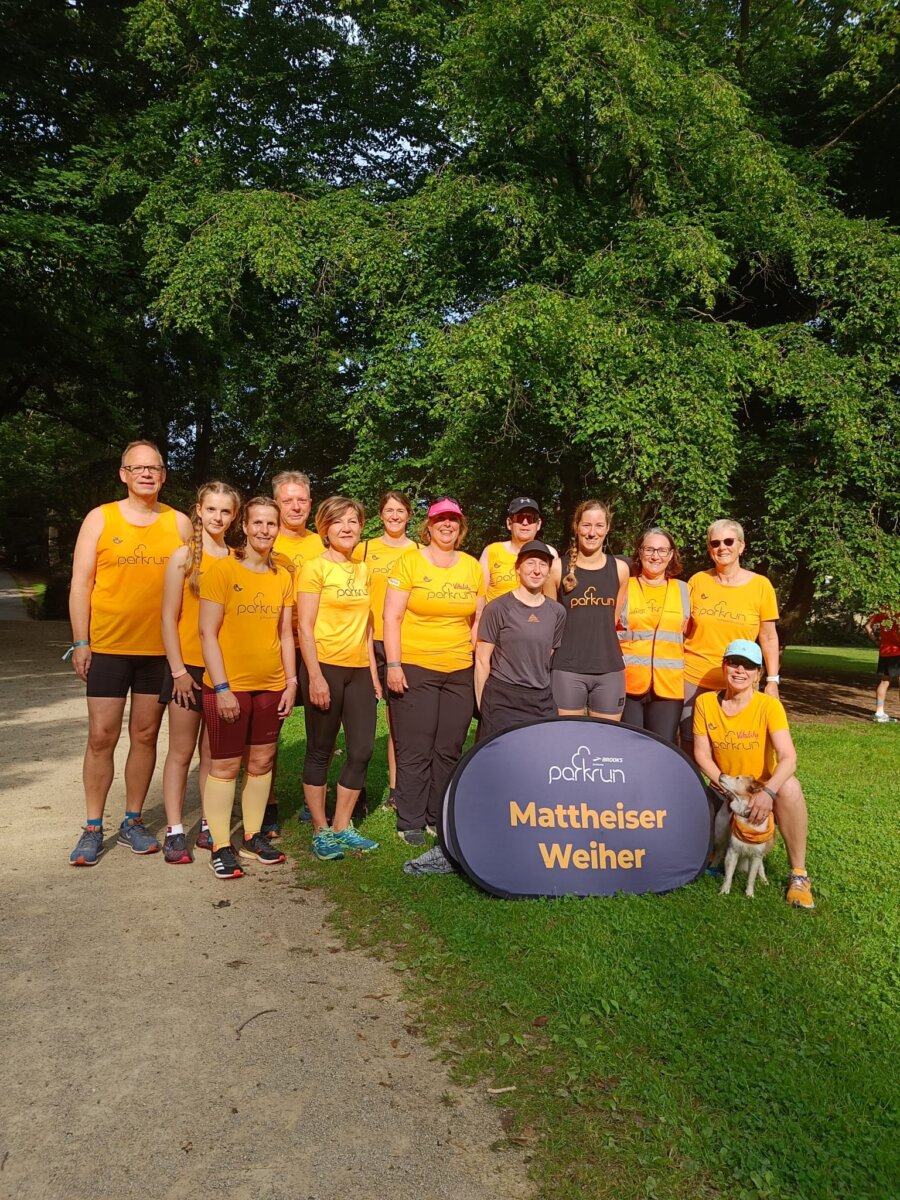 Auch das Team vom Mattheiser parkrun freute sich über den Besuch, denn im eigenen Kernteam waren wegen des langen Wochenendes einige Helfende verreist und neben den vielen zusätzlichen Teilnehmenden in Apricot brachte die Gießener Gruppe auch mehrere tatkräftige Helfende mit. Das Fazit am Ende des Gruppenausflugs war erneut sehr positiv und eine Wiederholung in 2026 ist geplant, Reisezieloptionen sind natürlich auch schon angedacht.