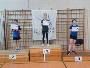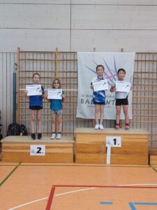 An beiden Tagen wurde von vormittags bis abends um Sätze und Punkte gekämpft. Im Mädcheneinzel U13 gelang es dabei Aileen Glöde sich bis ins kleine Finale zu spielen, welches sie dann auch deutlich gewann. Eigentlich nur als Trainerin mitgefahren gelang es am gleichen Tag auch Trainerin Caroline Krüger-Beyer den zweiten Platz zu erkämpfen, wobei sie nur knapp in drei Sätzen an der höher spielenden Turniersiegerin Christine Klitsch scheiterte. Am Sonntag folgten dann die Auftritte von den Doppeln. Hier holte sich sowohl Mia Krüger/Anastasia Sphylko (MD U11) als auch Benedikt Busch/Nevio Maikranz (JD U15) sehr gute zweite Plätze. Insgesamt sammelten die Hungener Federballspieler somit drei silberne und eine bronzene Medaille beim gut besuchten Turnier in Ginsheim ein.