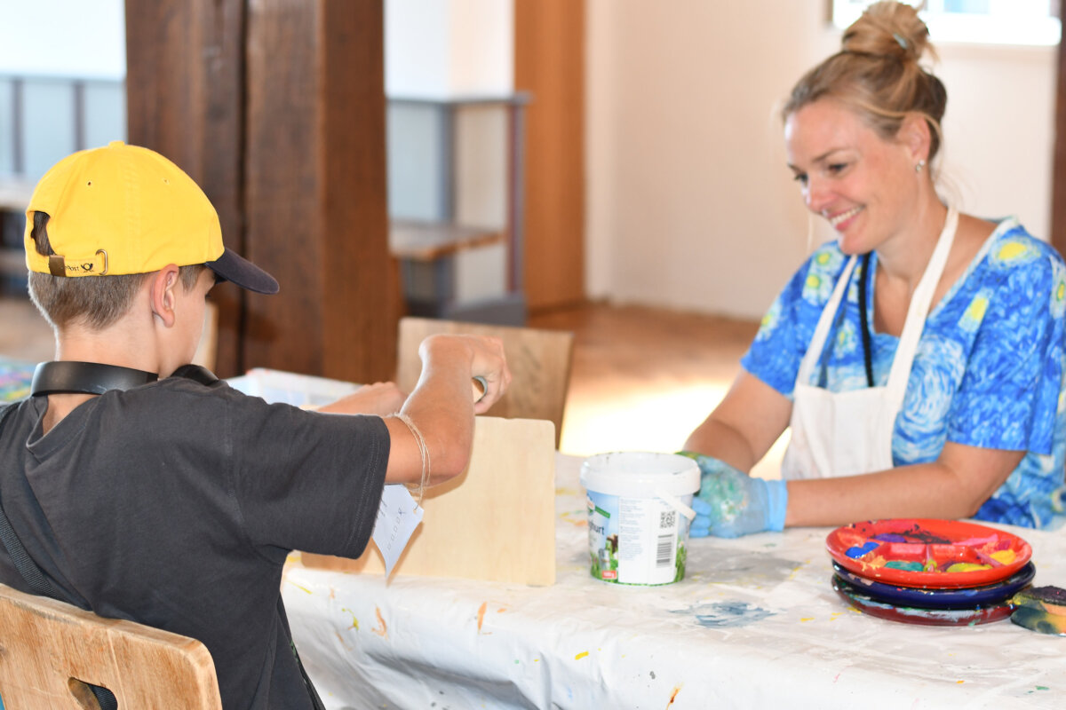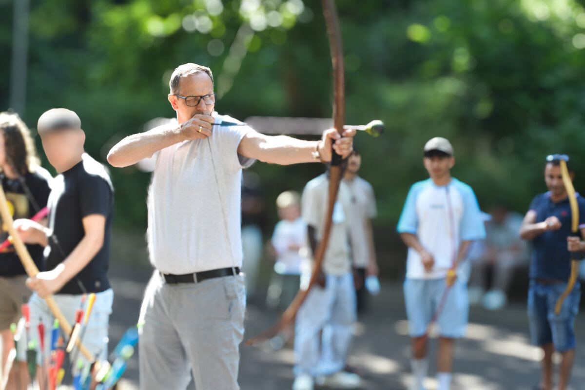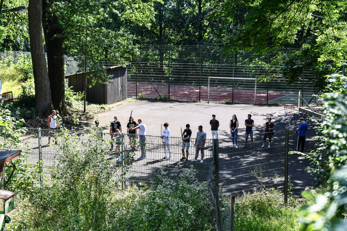 Auf dem Gelände oberhalb des idyllischen Lumdatals warteten auf die Kinder und Jugendlichen viele spannende Aktions- und Bewegungsangebote: Vom Sackhüpfen über Seilziehen bis hin zu Wikingerschach und Bogenschießen – letzteres mit freundlich zur Verfügung gestellten Ausrüstung des Live-Rollenspielvereins Ig-Larp e.V. aus Maintal – konnten die Teilnehmer*innen an verschiedenen Stationen ihre Geschicklichkeit und Ausdauer unter Beweis stellen. Ein weiterer Höhepunkt war das kreative Gestalten von Namensschildern – eine Aktion, die nicht nur Bastelfreude weckte, sondern auch das Gemeinschaftsgefühl stärkte. Wer alle Herausforderungen meisterte, durfte sich am Ende über eine kleine Belohnung freuen.