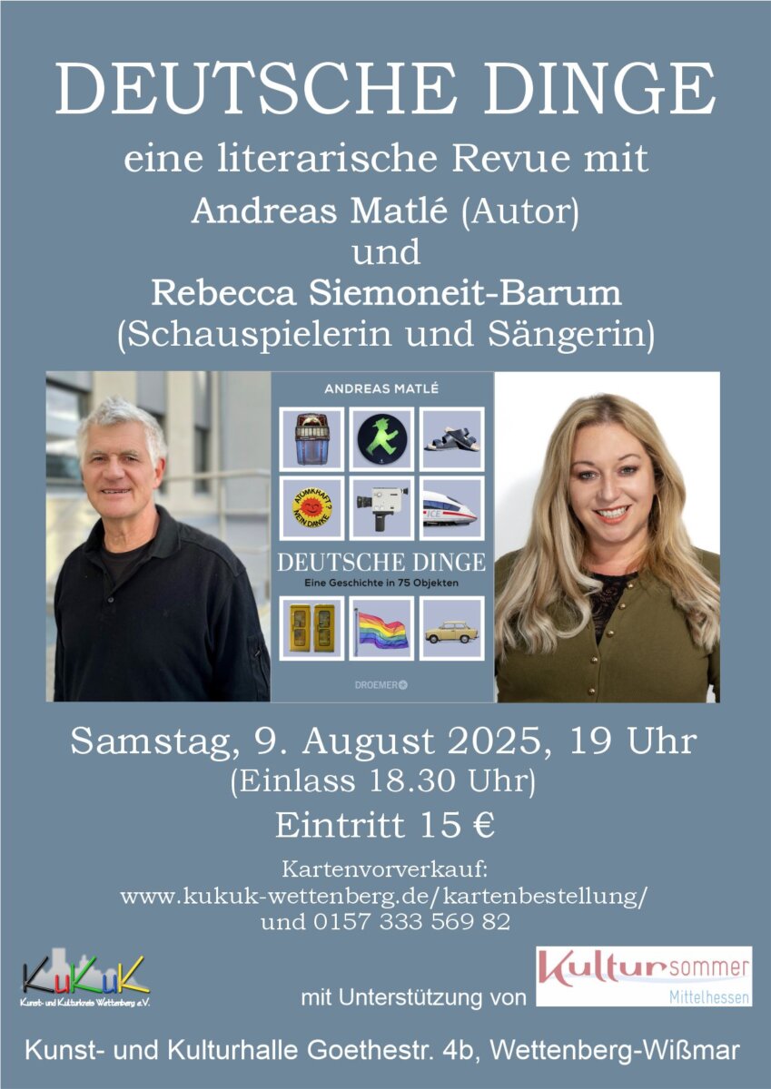 Hawaii-Toast, Pril-Blume, Tamagotchi – diese und 72 weitere Objekte der Nachkriegsgeschichte stehen im Mittelpunkt des Buches „Deutsche Dinge – Eine Geschichte in 75 Objekten“ von Andreas Matlé erschienen im Verlag Droemer. Die „Deutschen Dinge“ kommen nun in einer unterhaltsamen Revue auf die Bühne: Am Samstag, 9. August, 19.00 Uhr, in der KuKuK-Halle in Wettenberg-Wißmar im Rahmen einer Veranstaltung des Kultursommers Mittelhessen.
