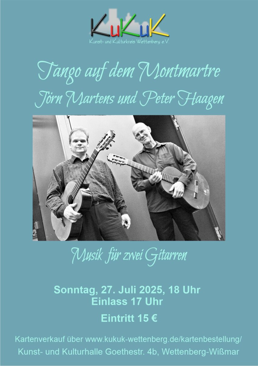 Mit einem neuen Musikprogramm geht das Gießener Gitarrenduo Haagen/Martens mit den Gitarristen Jörn Martens und Peter Haagen auf die Konzertbühne . Unter dem Titel „Tango auf dem Montmartre“ präsentieren sie eine Auswahl französischer Komponisten, die in stetigem Wechsel mit argentinischen Tango-Kompositionen aufeinander treffen.
