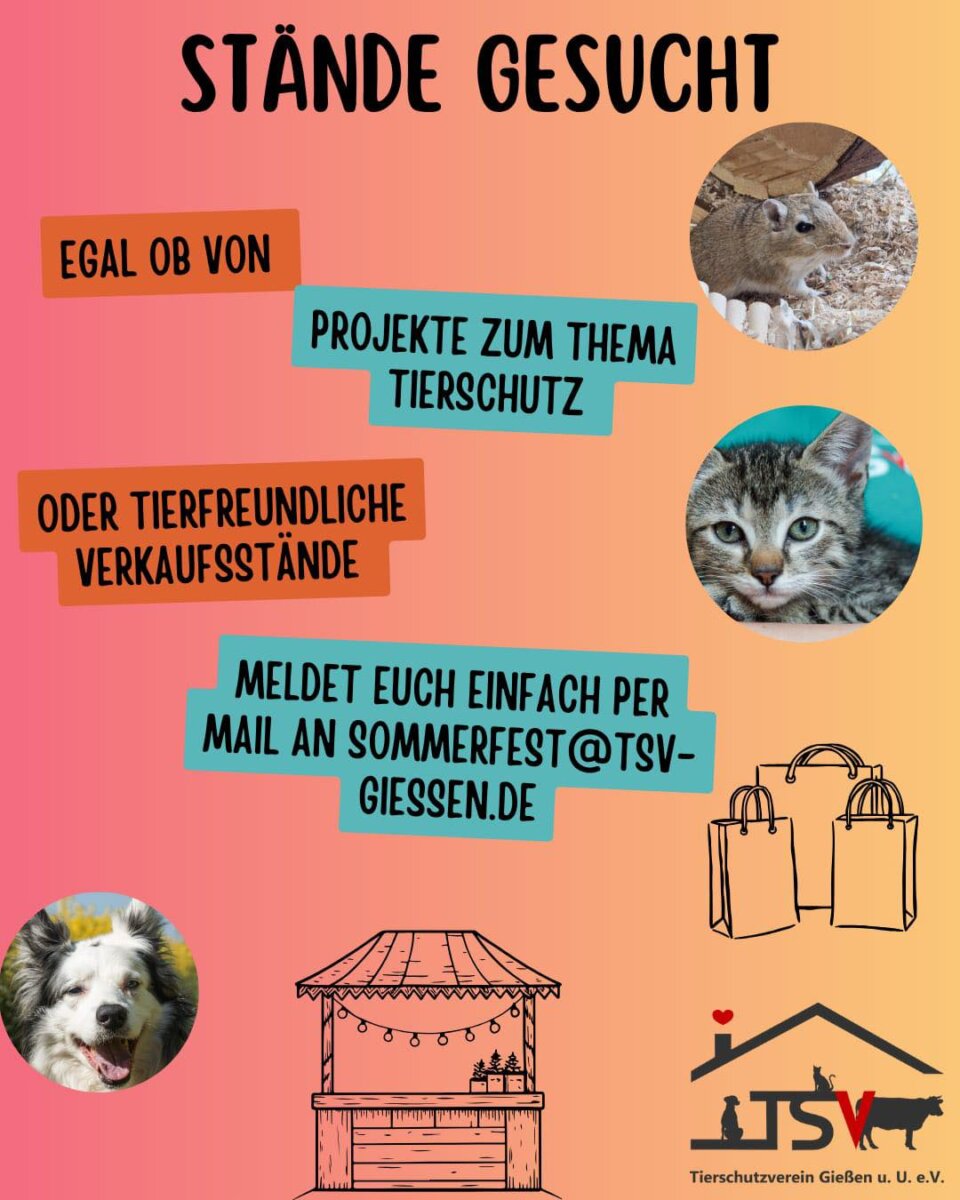 Das Tierheim Gießen öffnet auch in diesem Jahr wieder seine Tore für das beliebte Sommerfest und lädt Aussteller von tierfreundlichen Produkten sowie Initiatoren von Herzensprojekten ein, sich daran zu beteiligen. Wer nachhaltige und tierethisch korrekte Produkte anbietet oder ein soziales Projekt zum Wohl von Tieren vorstellen möchte, findet auf dem Fest die ideale Plattform.