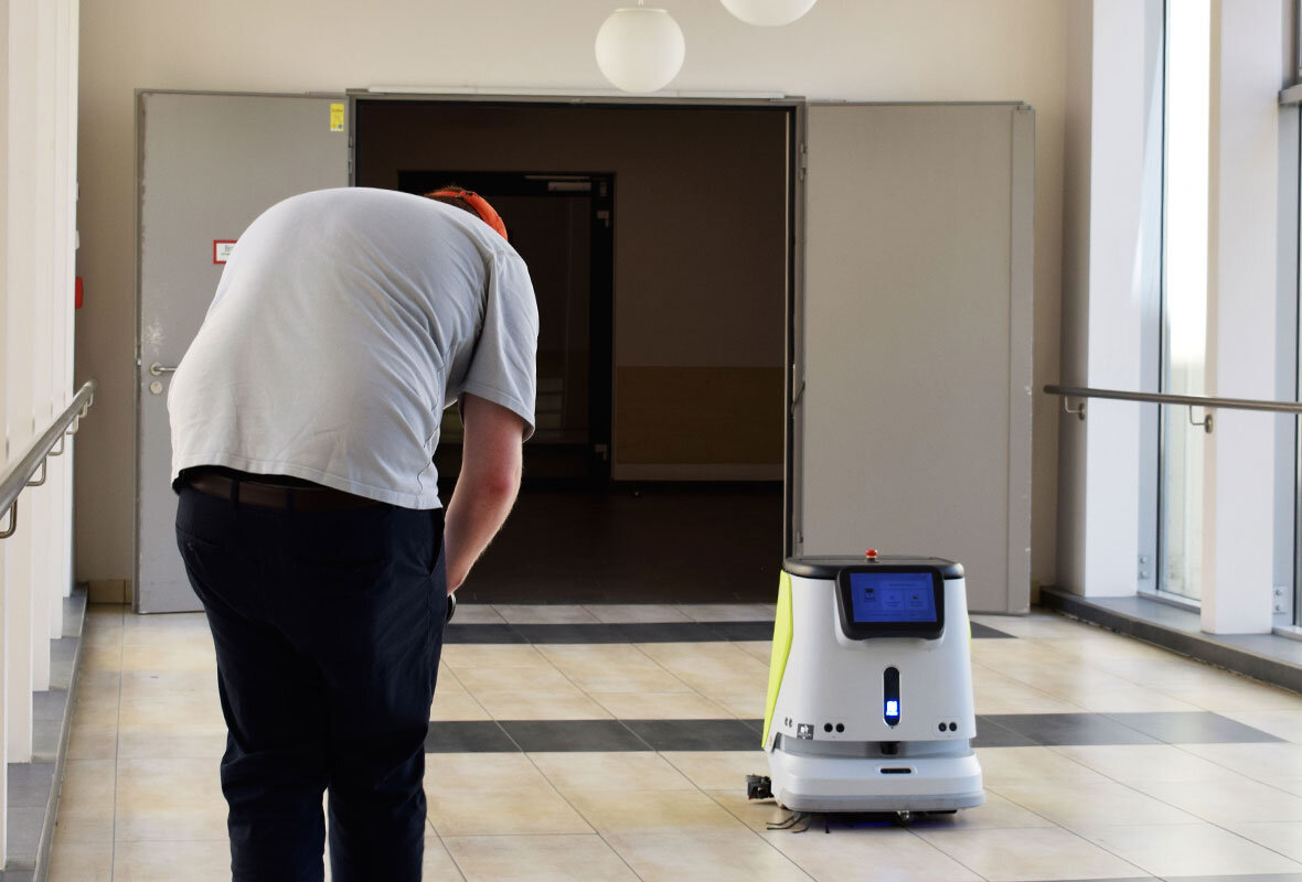 Unser autonomer Reinigungshelfer, der täglich dafür sorgt, dass Böden zuverlässig und hygienisch sauber bleiben, steht dabei gänzlich im Mittelpunkt. Er erinnert in seinem ruhigen, unermüdlichen Einsatz an den bekannten Filmcharakter aus „WALL·E – Der Letzte räumt die Erde auf“.