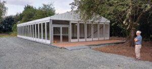 Mehrere hundert Quadratmeter Mutterboden mit Vegetation wurden entfernt und eine Schotterschicht eingebaut. Auf dieser Schicht wurde das neue Gebäude, ähnlich einem Zelt mit festen Wänden und einer großen Glasfront Richtung Spielfeld aufgebaut und mit einer Warmluftheizung ausgestattet. Die Heizung deutet darauf hin, dass das Gebäude nicht nur in der warmen Jahreszeit genutzt werden soll.