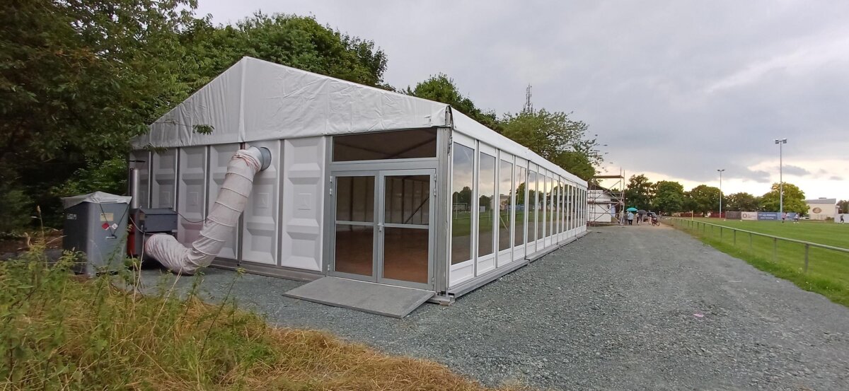 Mehrere hundert Quadratmeter Mutterboden mit Vegetation wurden entfernt und eine Schotterschicht eingebaut. Auf dieser Schicht wurde das neue Gebäude, ähnlich einem Zelt mit festen Wänden und einer großen Glasfront Richtung Spielfeld aufgebaut und mit einer Warmluftheizung ausgestattet. Die Heizung deutet darauf hin, dass das Gebäude nicht nur in der warmen Jahreszeit genutzt werden soll.