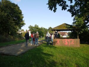 Der nächste Punkt des Rundgangs waren Pavillon und Bouleplatz unter der Jahneiche. Hier kommt es leider immer wieder zu Vandalismus, was sehr schade ist, denn der einst neu errichtete Pavillon lädt leider nicht mehr zu viel Gemütlichkeit ein. Es ist schön, dass es einen solchen Ort gibt, wo sich Bürger jeden Alters aufhalten können, aber er sollte auch von allen pfleglich behandelt werden. Ein kleiner Schwank aus früheren Zeiten wurde auch erzählt, so wurde dort unter der Jahneiche früher Handball gespielt.