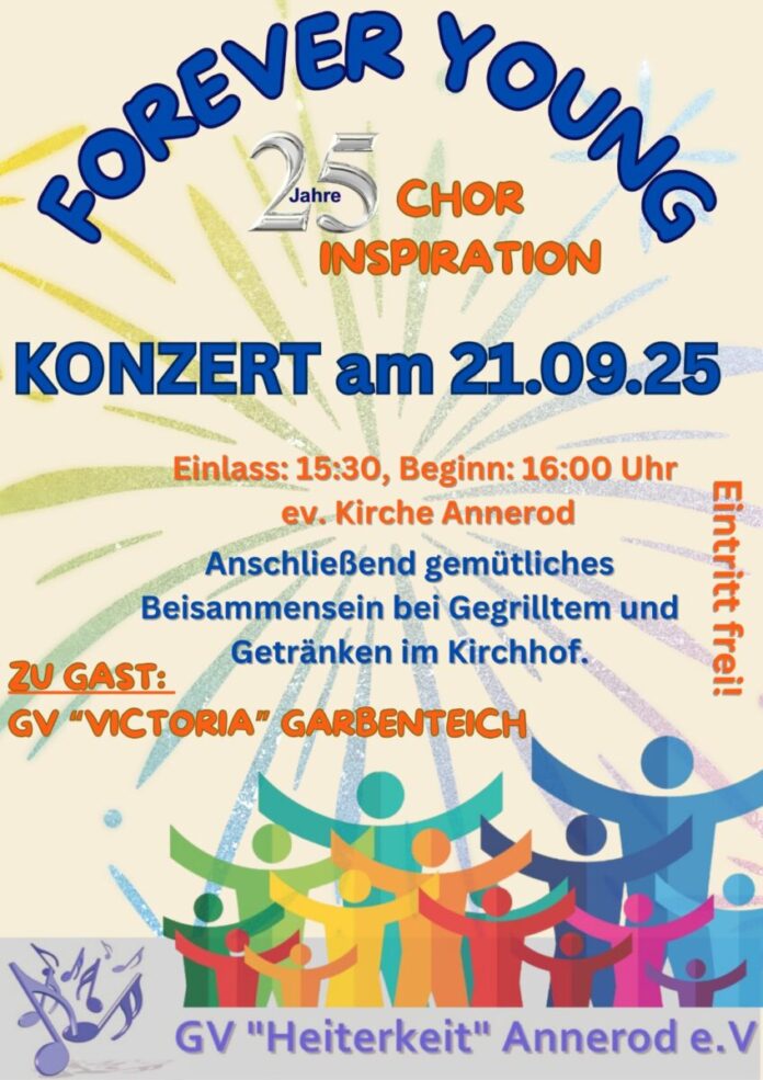 Am 21.09.2025 feiert der gemischte Chor Inspiration des Gesangverein Heiterkeit Annerod sein 25jähriges Bestehen und veranstaltet ein Konzert um 16:00 in der Anneröder Kirche!