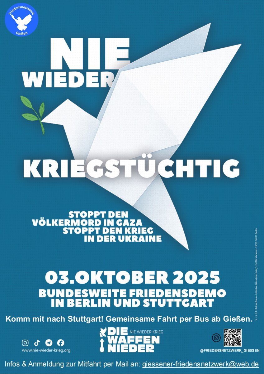 Nachfolgend noch der Aufruf der Initiative “Nie wieder Krieg” zu den beiden Großdemonstrationen in Berlin und Stuttgart: