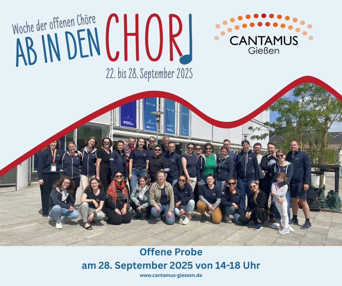 Vom 22. bis zum 28. September 2025 öffnen Chöre und Vokalensembles in ganz Deutschland wieder allen Interessierten die Türen zu ihren Proben. Mit dieser Aktion soll neuen Mitsängerinnen und -sängern die Gelegenheit geboten werden, unkompliziert musikalisch Kontakt zu knüpfen. Nach den guten Erfahrungen in den Jahren 2023 und 2024 gehört auch Cantamus Gießen wieder zu den Ensembles, die an der „Woche der offenen Chöre“ teilnehmen.